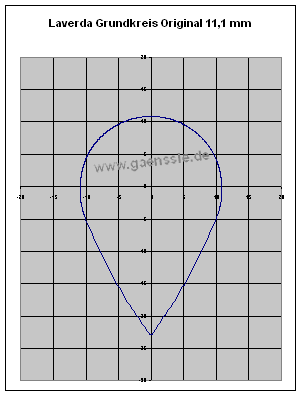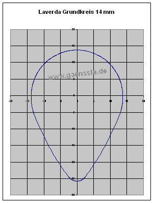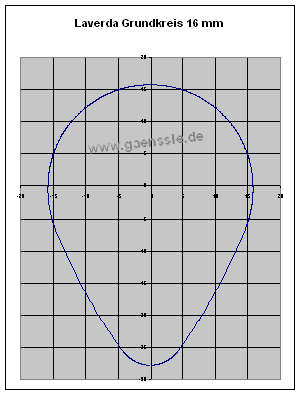 Warnhinweis! Bitte diese Ausführungen nicht als allgemeinen Tuningtipp für Laverda zu verstehen und einfach eine Nockenwelle mit 16 mm Grundkreis und 12 mm Hub einbauen. Die gesamte Nockenform muss im Bereich von hundertstel Millimetern stimmen sonst drohen schwere Motorschäden! Ohne genaue Berechnung funktioniert das nicht!